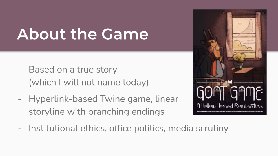 I’ll be speaking about Goat Game: A Hollow-Horned Rumination, a hyperlink-based game I made about the psychological toll of navigating ethical questions within an institution. You might remember it if you were watching IFComp last fall. Goat Game was my Senior Degree Project at RISD, and this talk was adapted from my thesis paper.